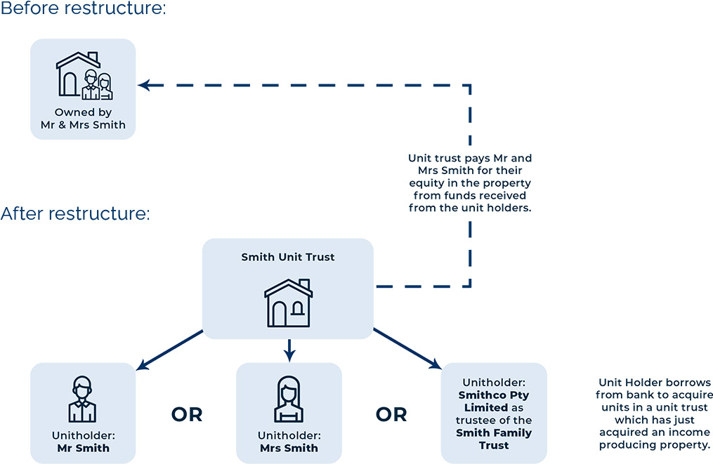 Mr Smith, a married father of two, owns a residential or commercial rental property in his name. He wishes to move it to a trust so that he has flexibility of whom within his family may benefit from the property and/or for asset protection purposes. If it is a development site, he might want to put it in an appropriate structure.