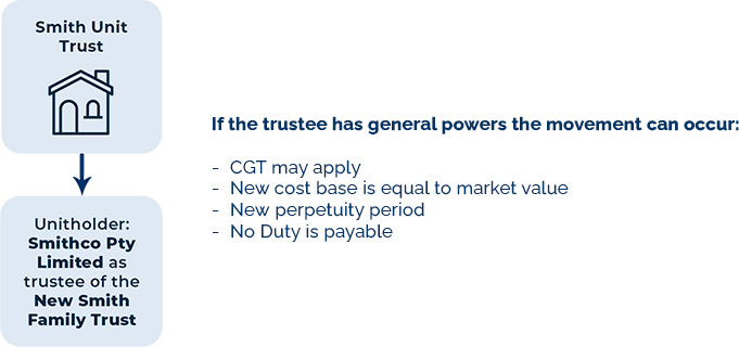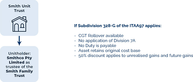 The Smith Unit Trust owns 3 properties with different cost bases and market values. It is desirable to separate the 3 properties so that each property is owned by a separate unit trust. As long as the conditions in Subdivision 126-G of the Income Tax Assessment Act 1997 are met, any capital gain can be disregarded.