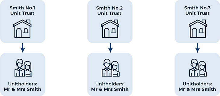 Mr and Mrs Smith own 3 properties as joint tenants. They wish to move each property to a unit trust to save on land tax and provide for flexibility. A capital gain may occur on the disposal to the various unit trusts.