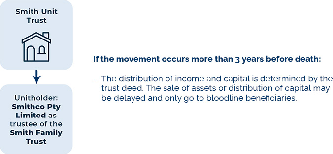 Mr Smith owns a property in his own name but is afraid relatives or others are going to challenge his decisions and his will under the Family Provision Act 1972. He decides to move the property to a trust structure and outline in the trust how the income and capital is to be appropriated by way of estate planning. If more than 3 years pass between the movement and his death the property is protected from family provision claims.