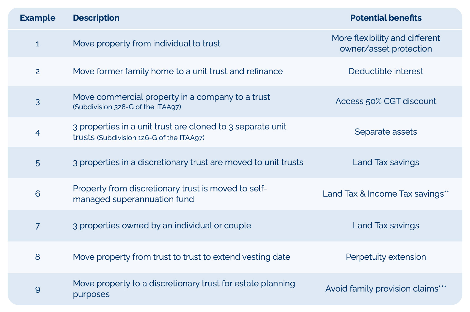 The following 9 examples are to provide a guide of what can be achieved when restructuring a taxpayer's affairs and the associated Stamp Duty, Income Tax and Land Tax savings*: