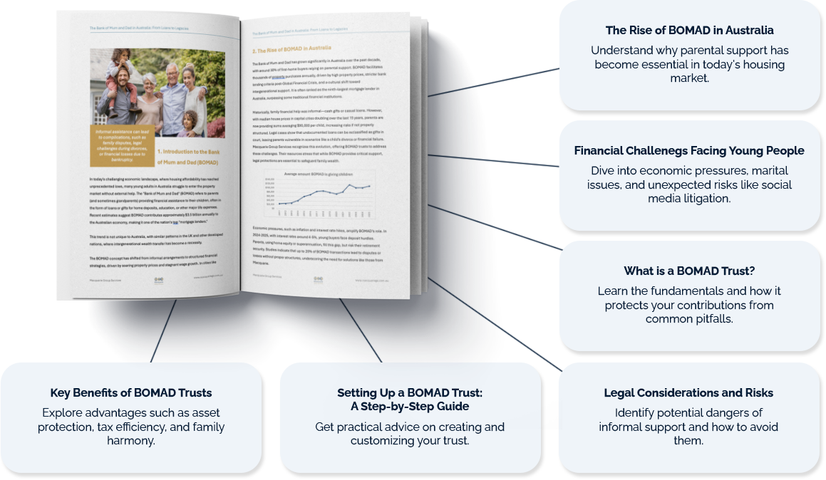 Learn about key issues surrounding the Bank of Mum and Dad. In the book we explore the growing role of parental financial support in Australia amid rising property prices and the challenges young people face, including financial hurdles, social media defamation risks, and increasing divorce rates. You'll gain insights into the basics of trusts and their key roles, discover what a BOMAD Trust™ is and how it operates to safeguard your wealth. With practical guidance on setup, legal risks, real-life case examples of parents lending or gifting funds, and estate planning concerns, the eBook contains everything you need to confidently navigate gifting or lending as the Bank of Mum and Dad.