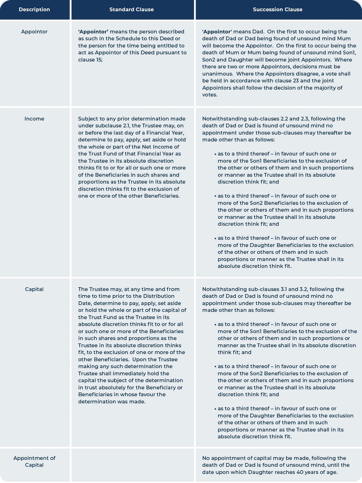 A Succession Trust Deed is one whereby the control of the trust and the distribution of income and capital is restricted following the death of one or more people.