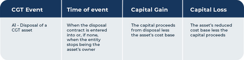 When you dispose of an asset that is subject to capital gains tax (CGT), it is called a CGT event. This is the point at which you make a capital gain or loss.