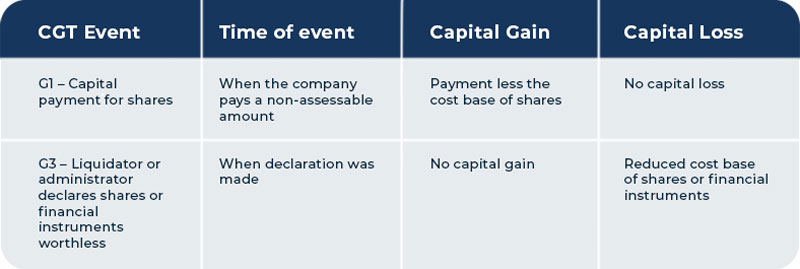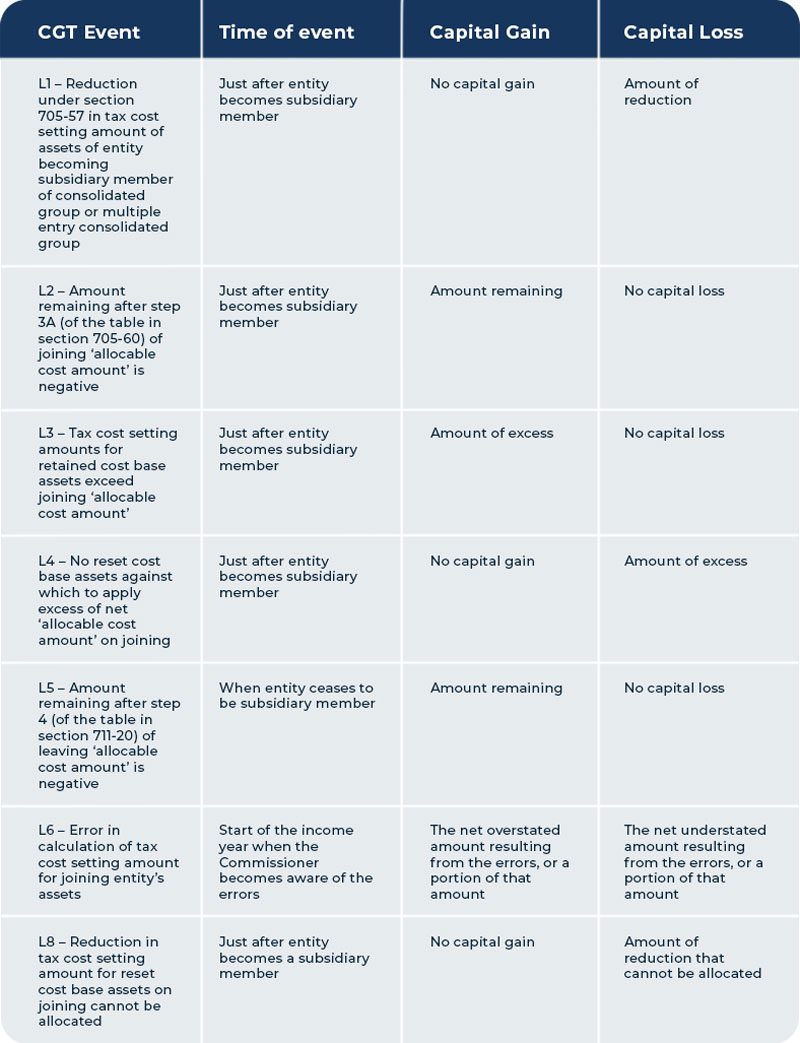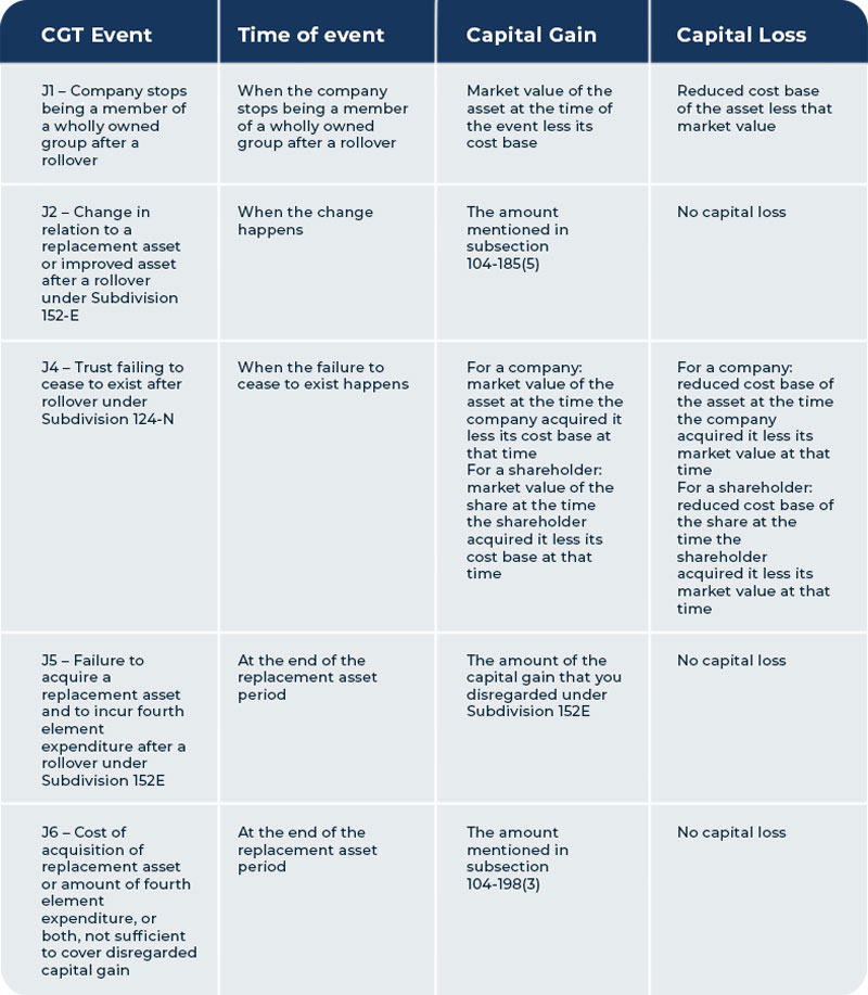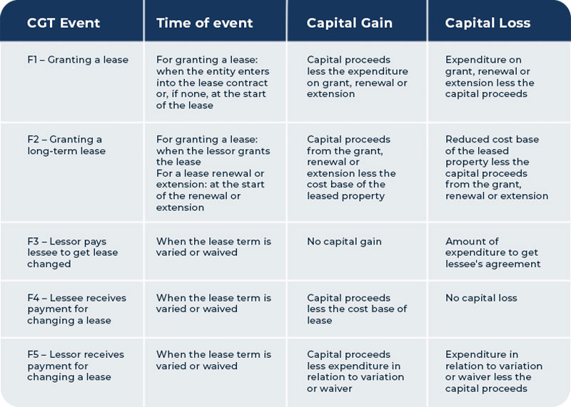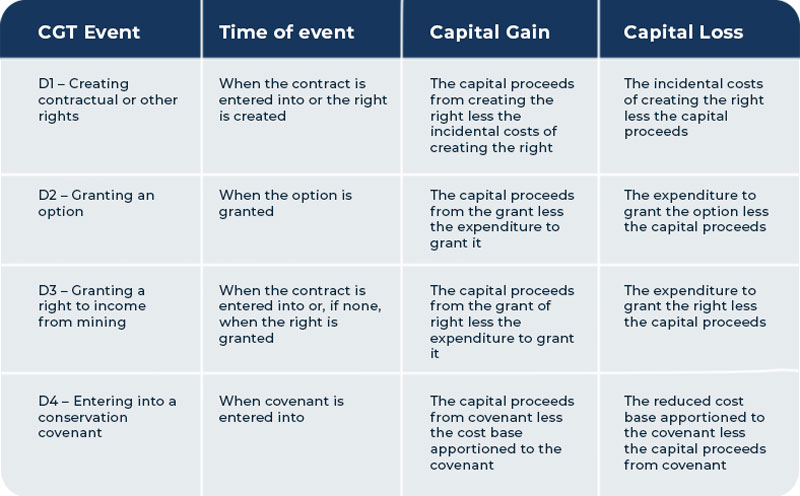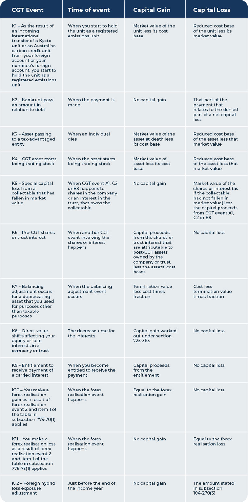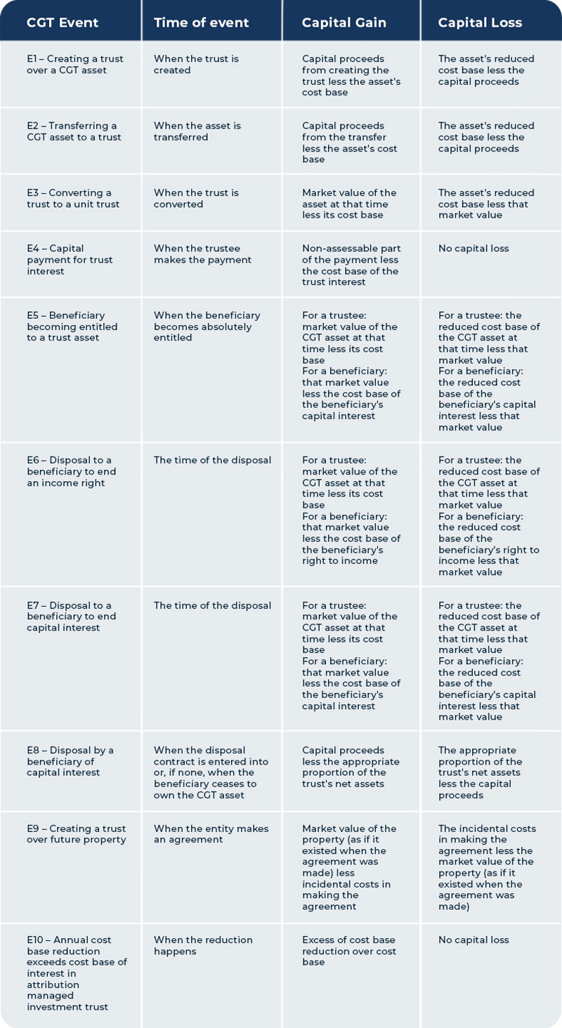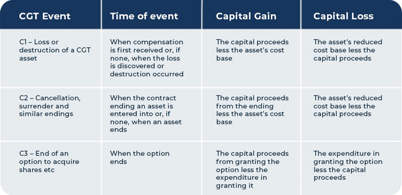 For more information about the CGT events listed below see Division 104 of the Income Tax Assessment Act 1997.