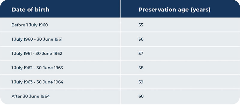 Access to super benefits is generally restricted to members who have reached preservation age. A person's preservation age ranges from 55 to 60, depending on their date of birth.